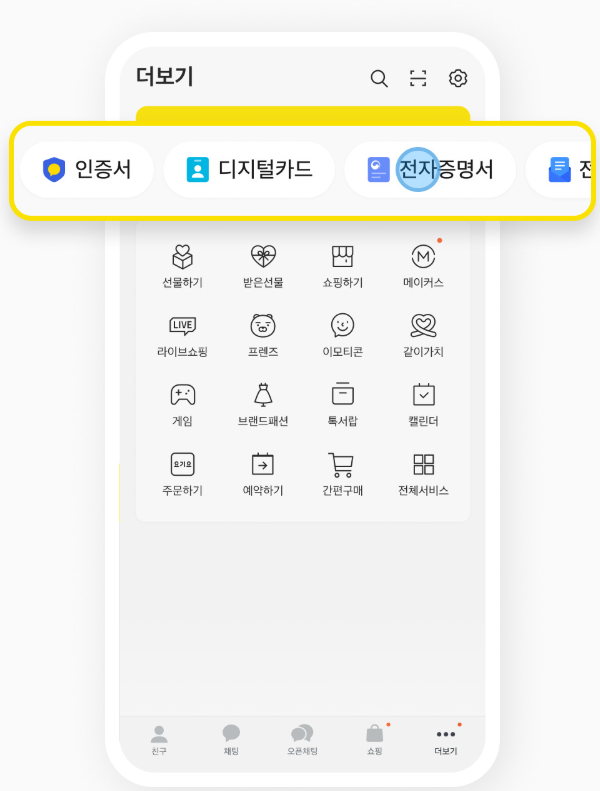 ‘더 보기’ 메뉴에서 ‘전자문서’ 항목을 클릭합니다. 만약 보이지 않으면, 카카오톡 검색창에 ‘전자문서’라고 입력해 찾을 수 있습니다.