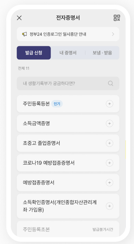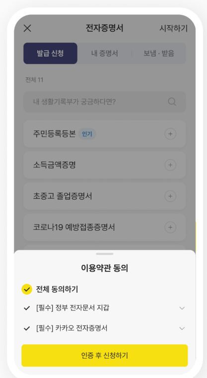 카카오톡에서 전자증명서 발급하기